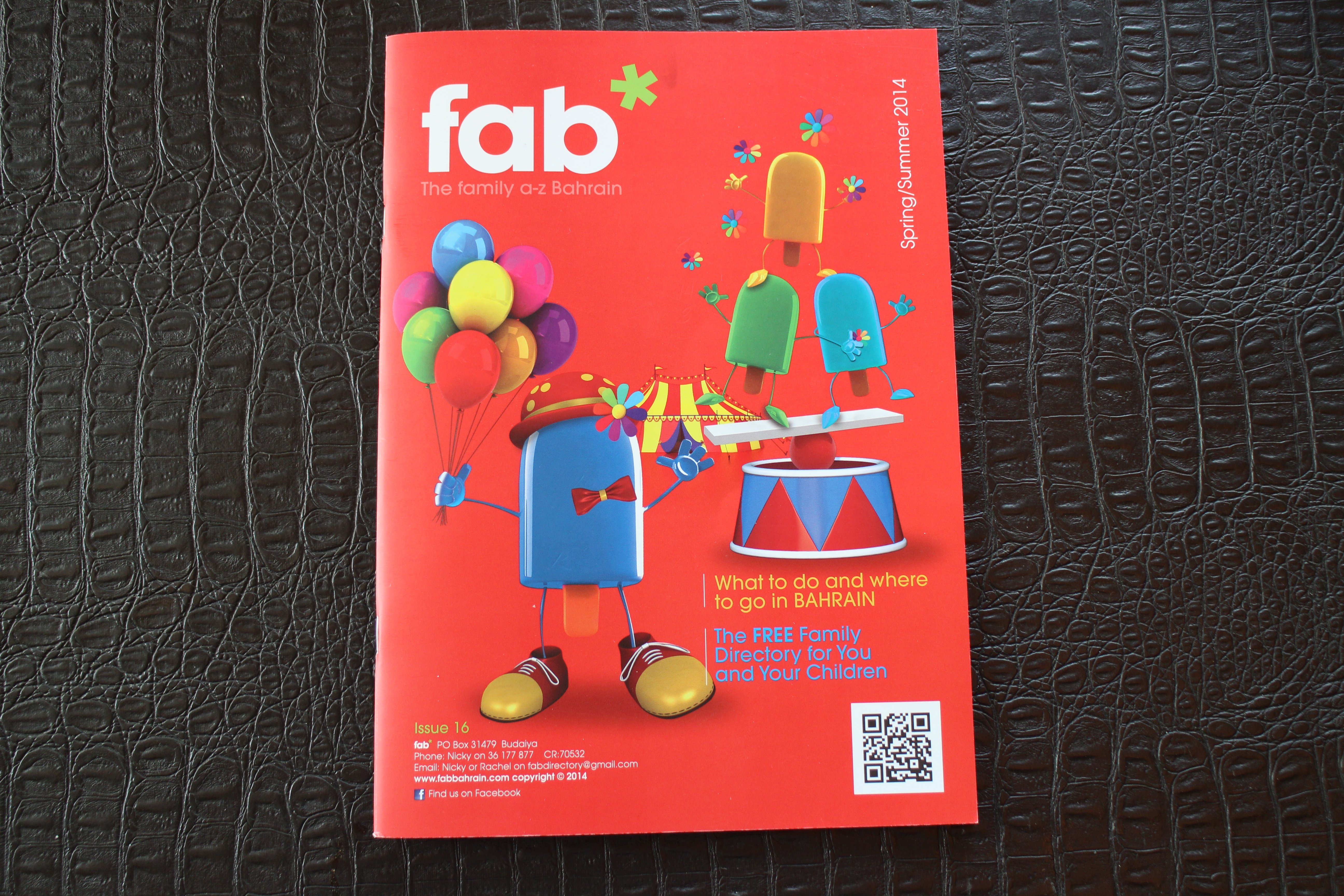 Fab is a periodical that is distributed every term to schools and bookstores. I usually find a copy at a major bookstore. It is essentially a guide to life in Bahrain. The Spring/Summer 2014 edition contains 44 pages that are packed with useful information on things to do and places that you can find on the island. You can also access this information at www.fabbahrain.com